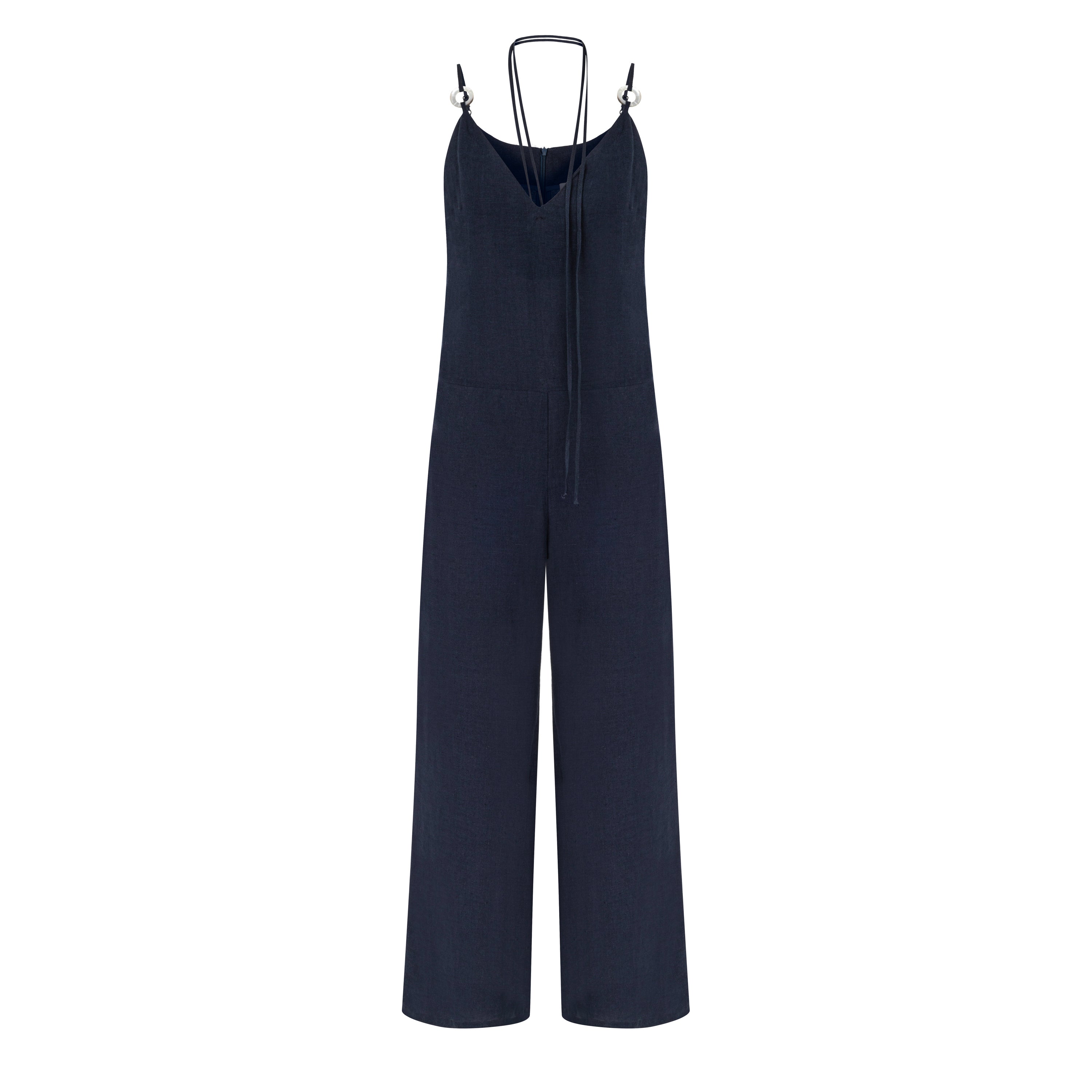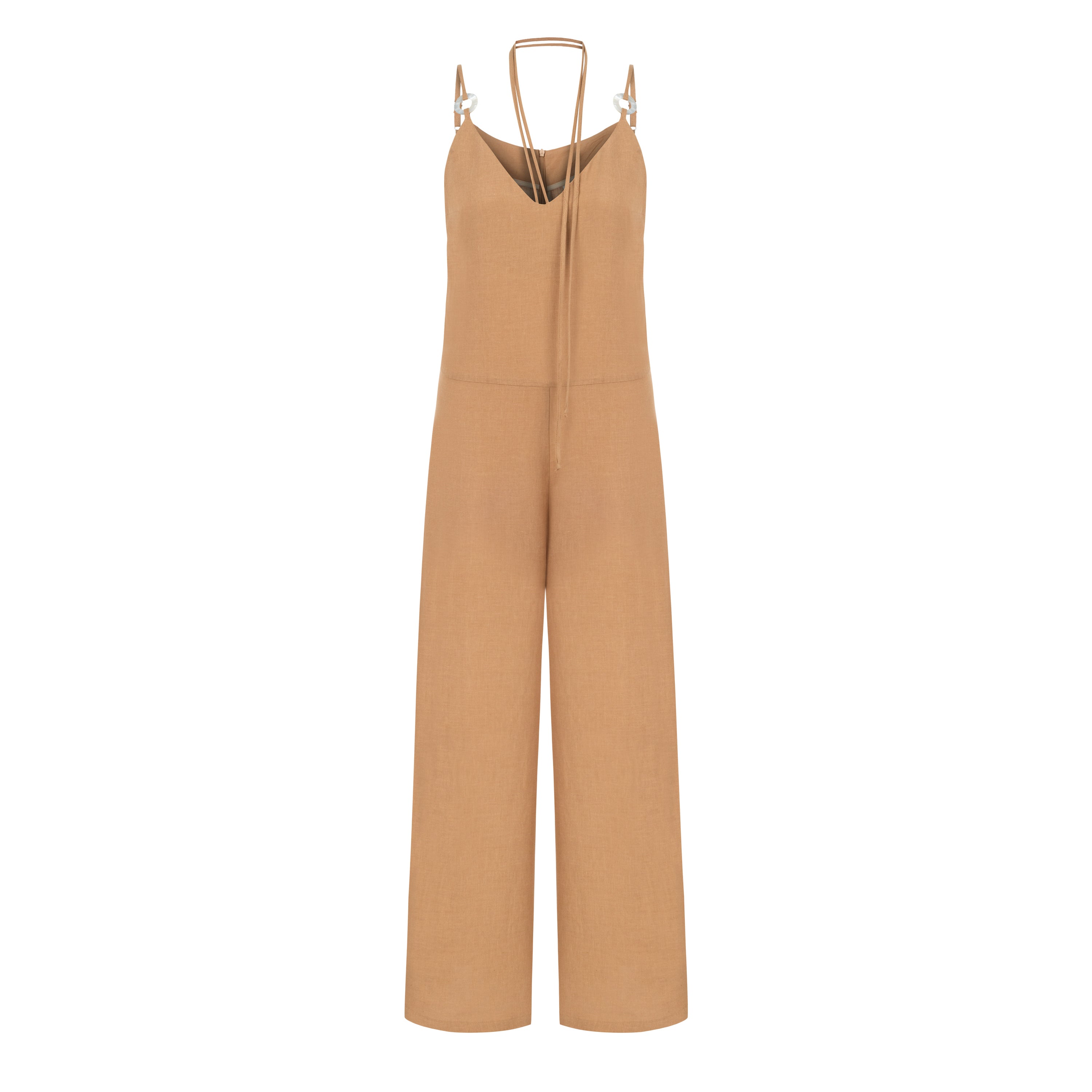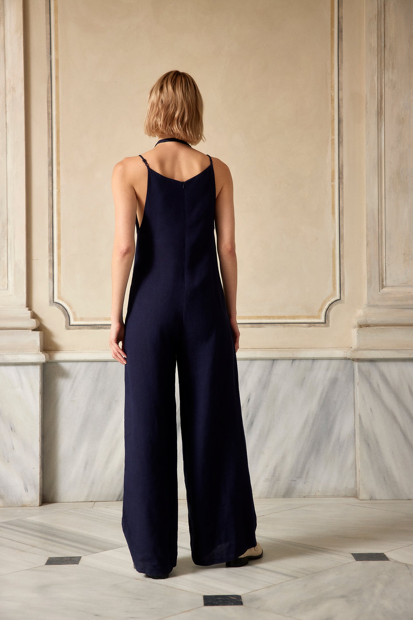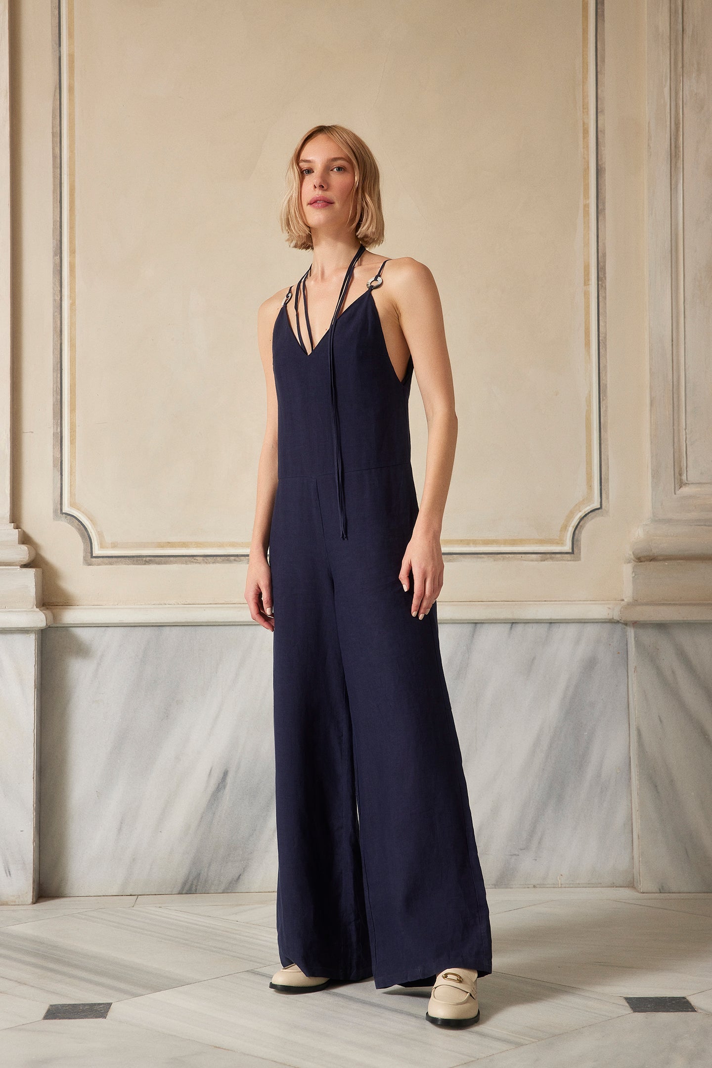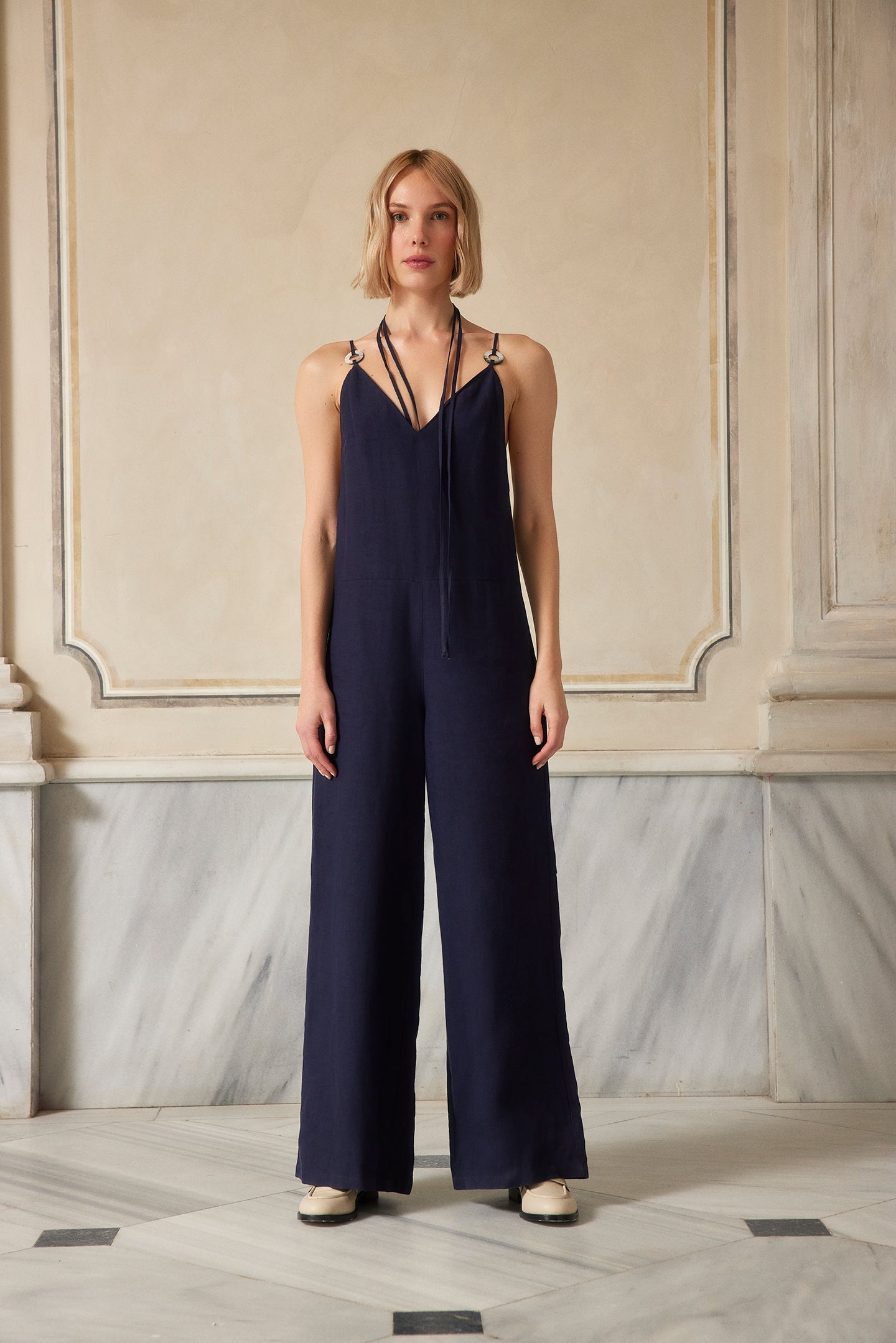 Wide leg jumpsuit, v-neck with spaghetti straps.