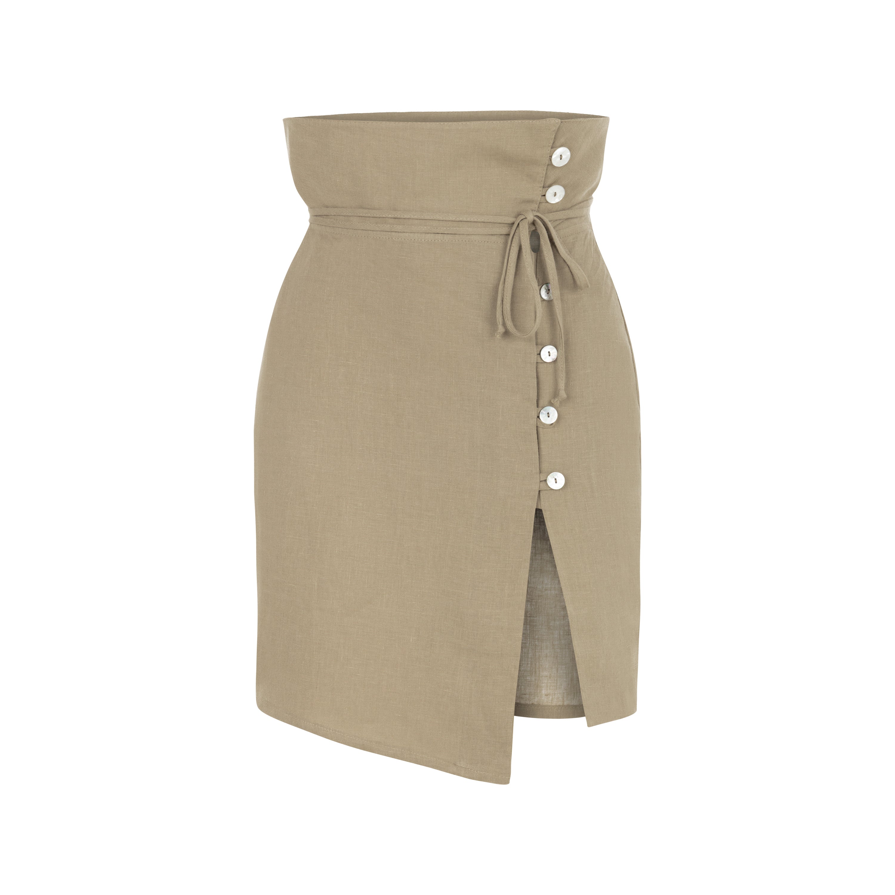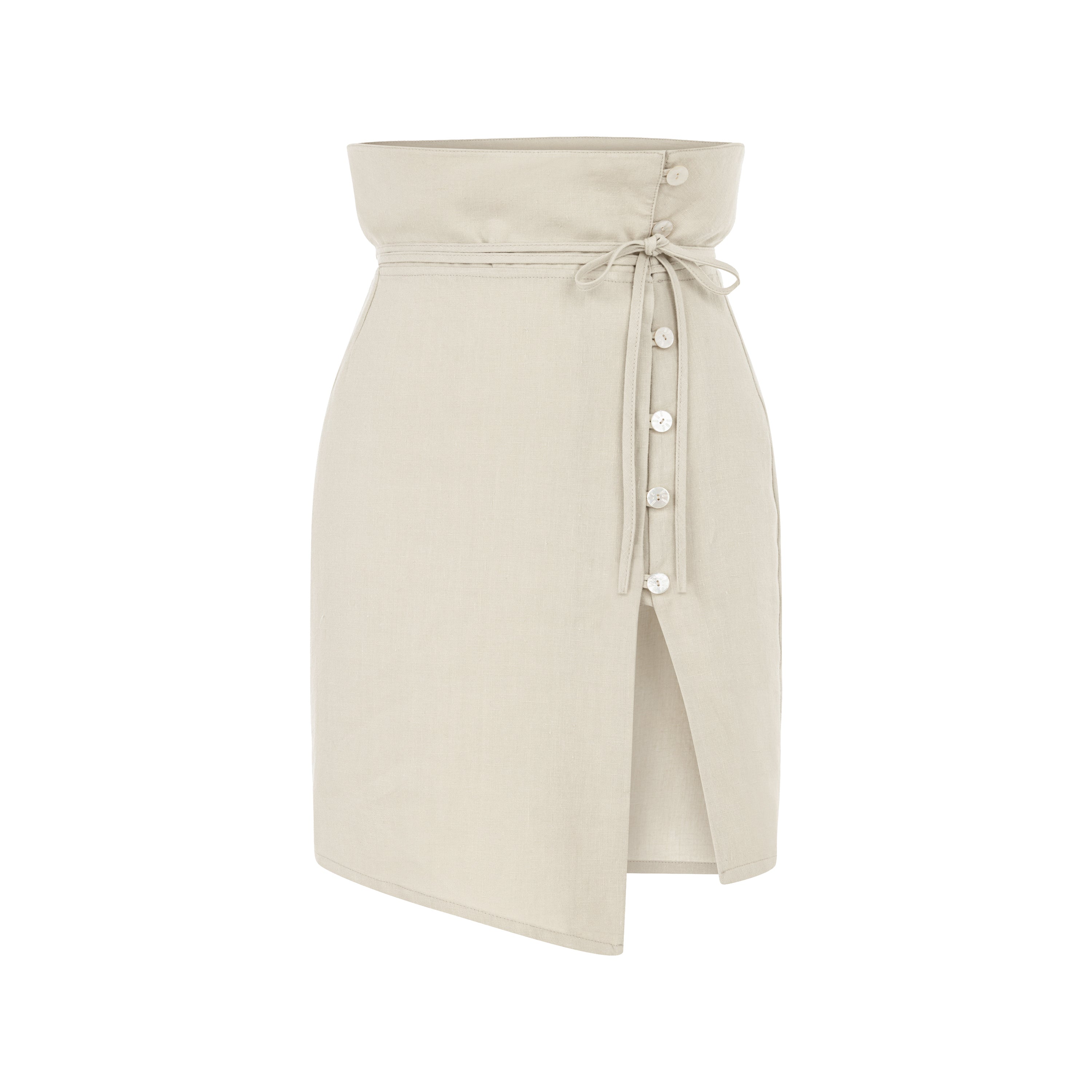 High-waisted mini skirt, button down asymmetrical slit with spaghetti strap belt.