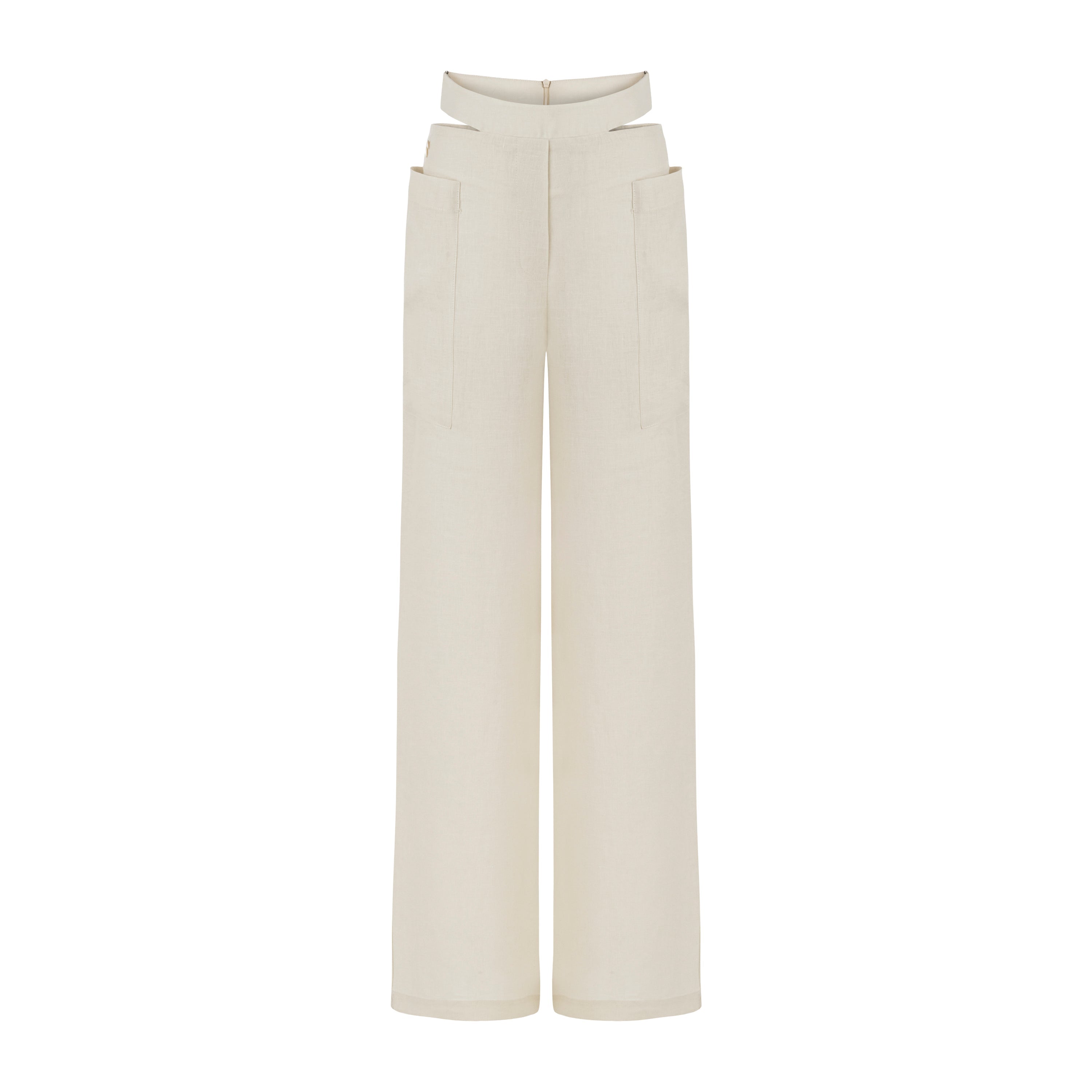 Wide leg pants, cutout at waist, side pockets.