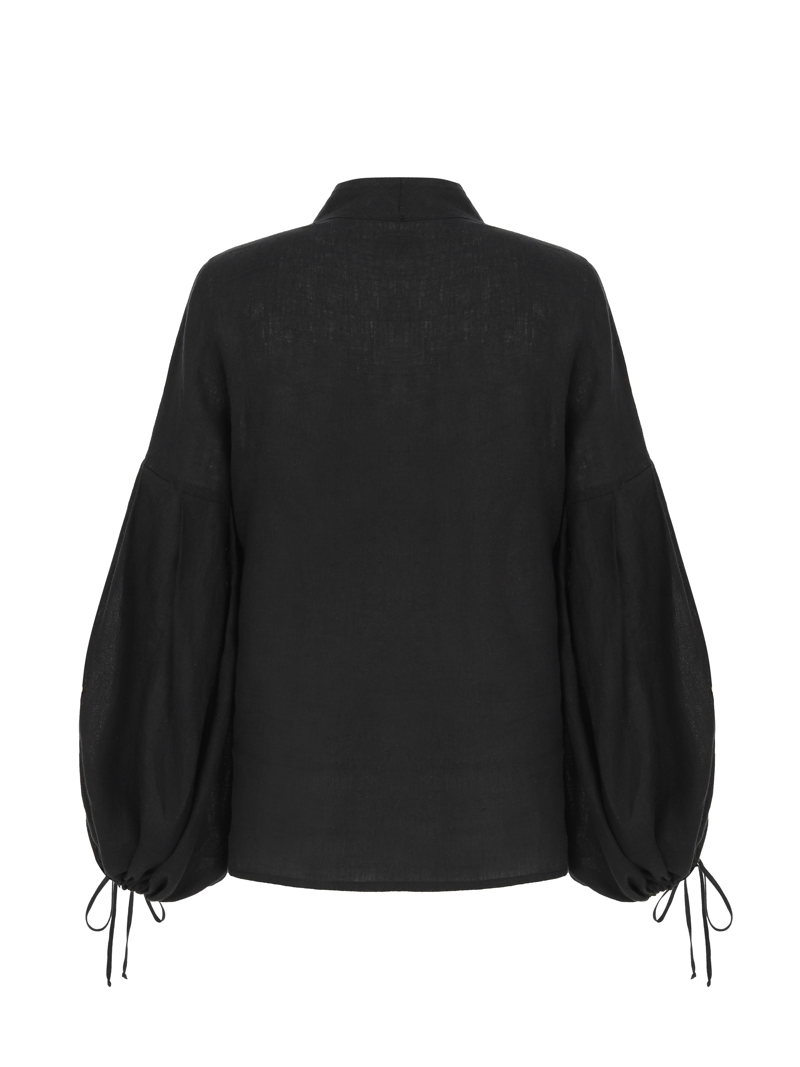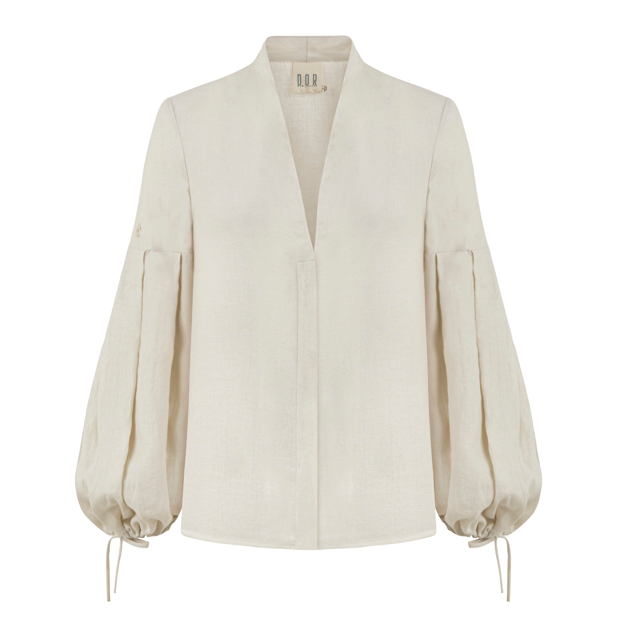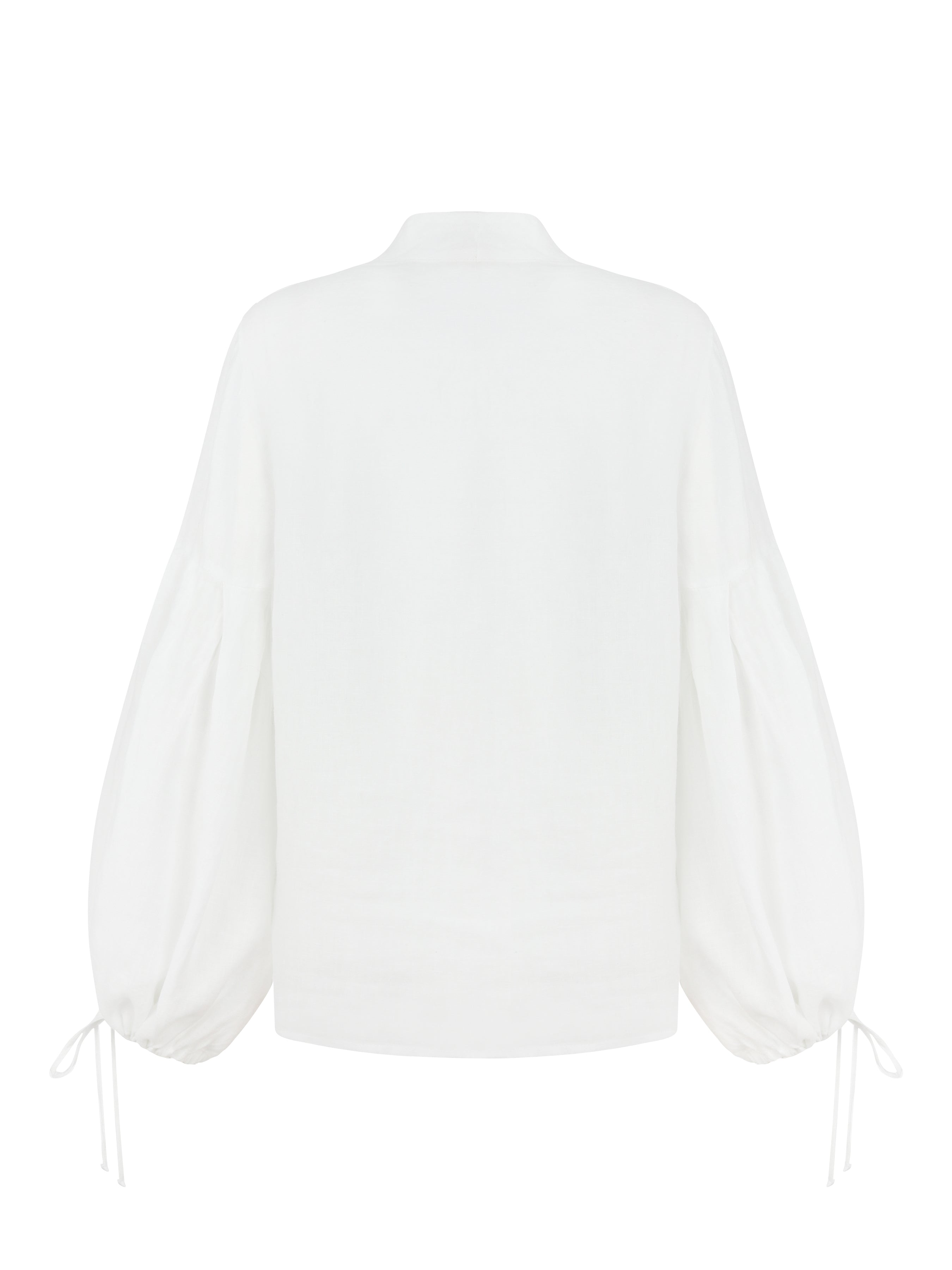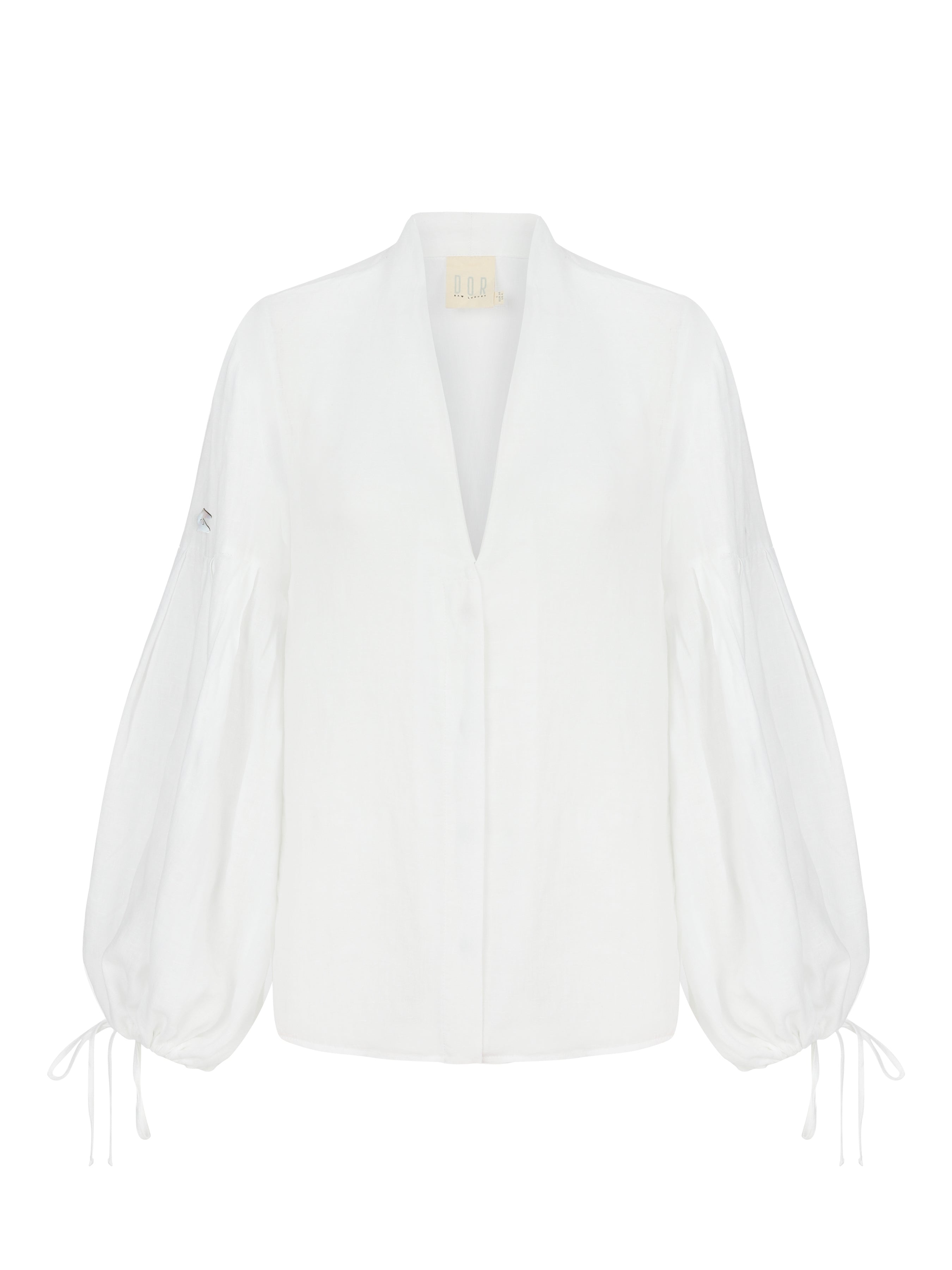 Crafted from lightweight linen, the Present Shirt features a clean, collarless neckline and voluminous pleated sleeves gathered with adjustable ties. A minimalist silhouette elevated by thoughtful detailing and natural texture.