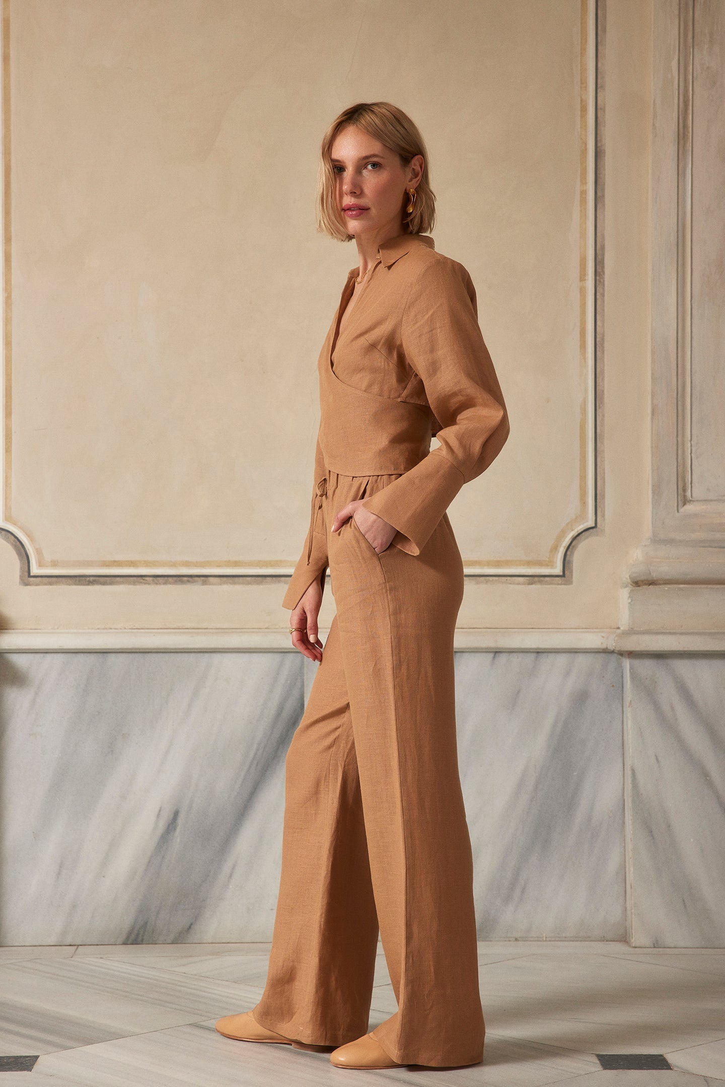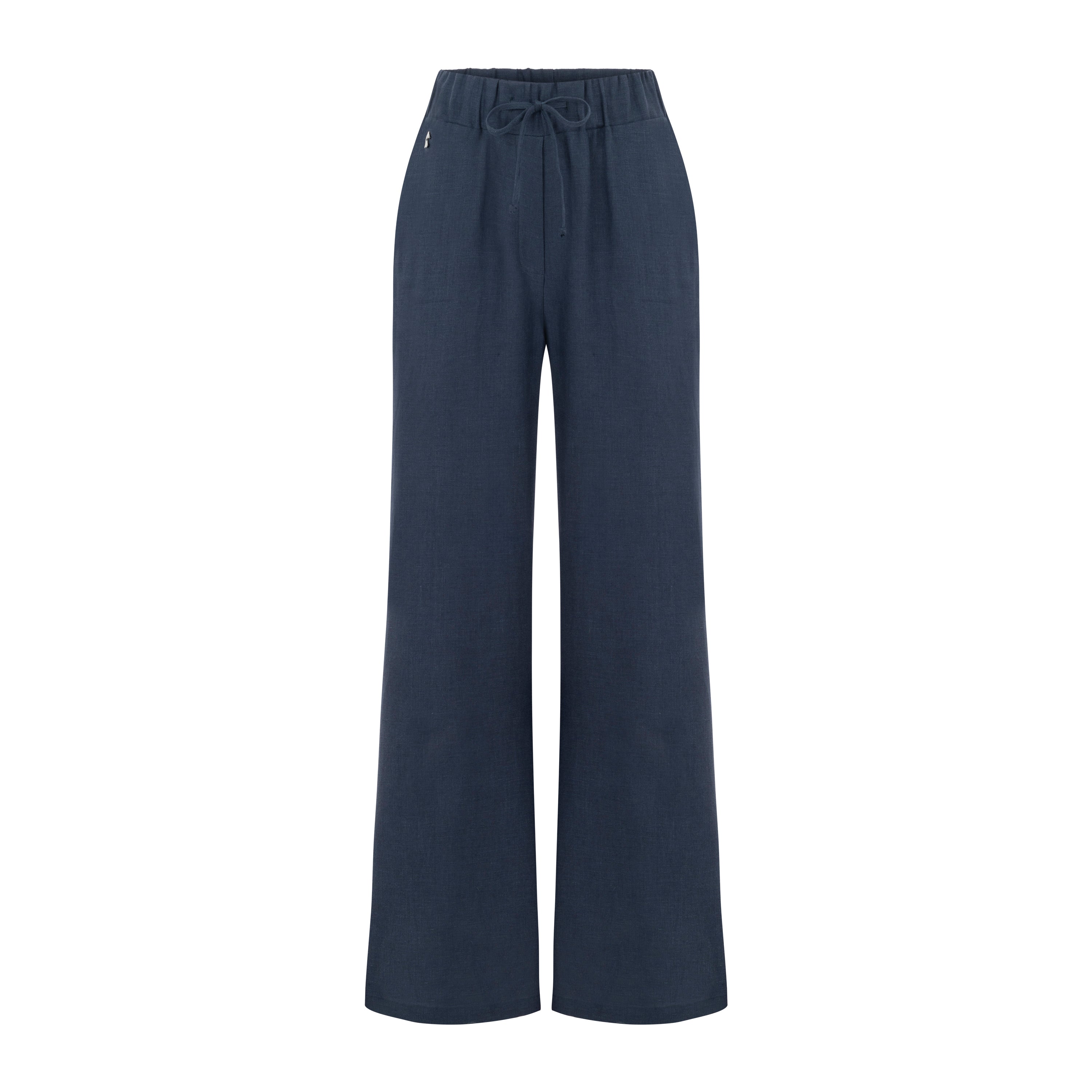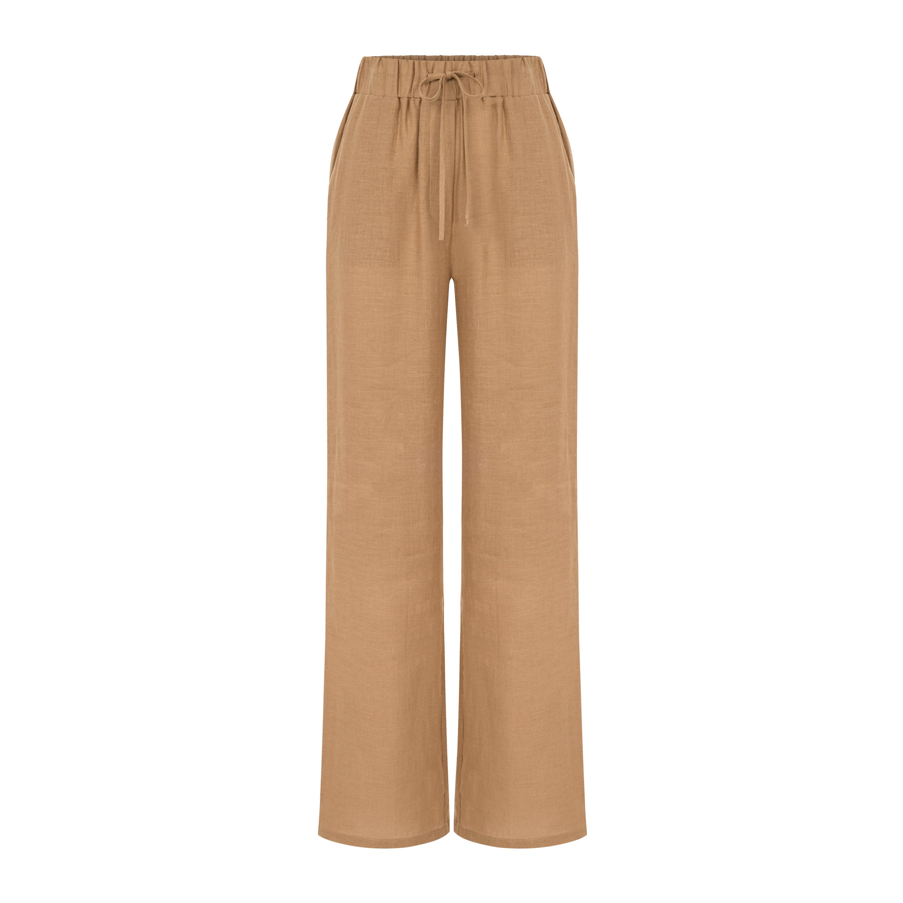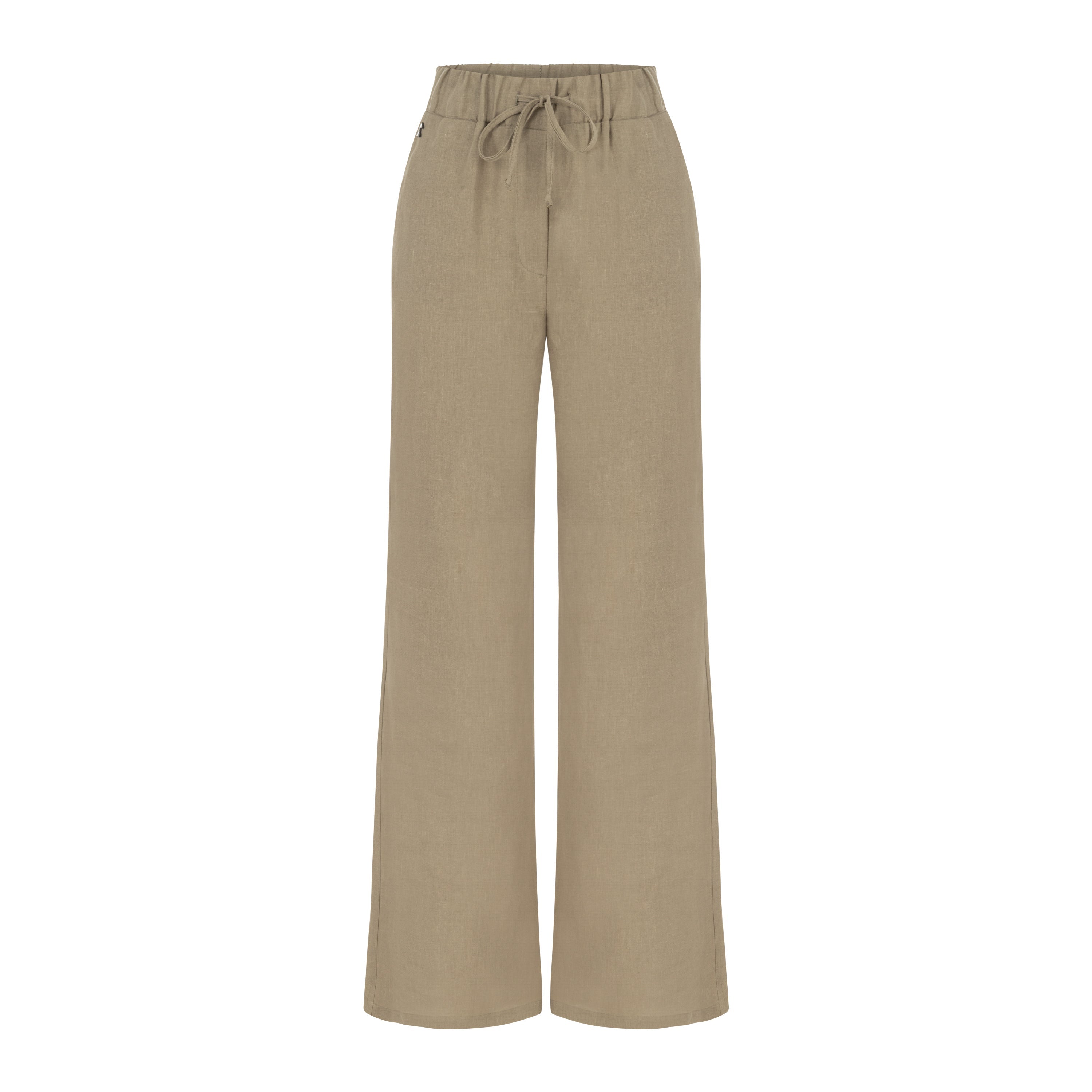 High-waisted straight-leg pants, elastic waistband with drawstring and side pockets.