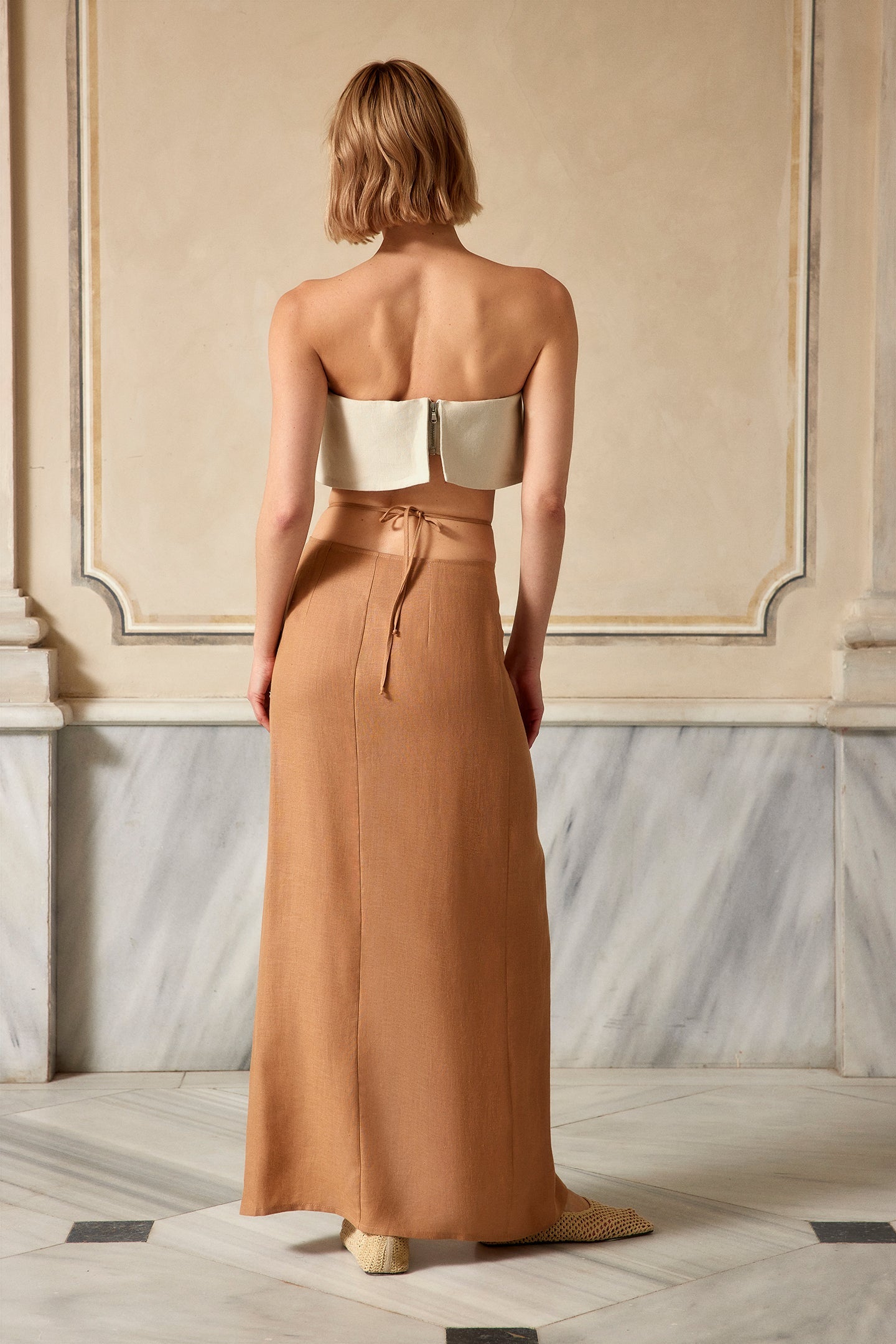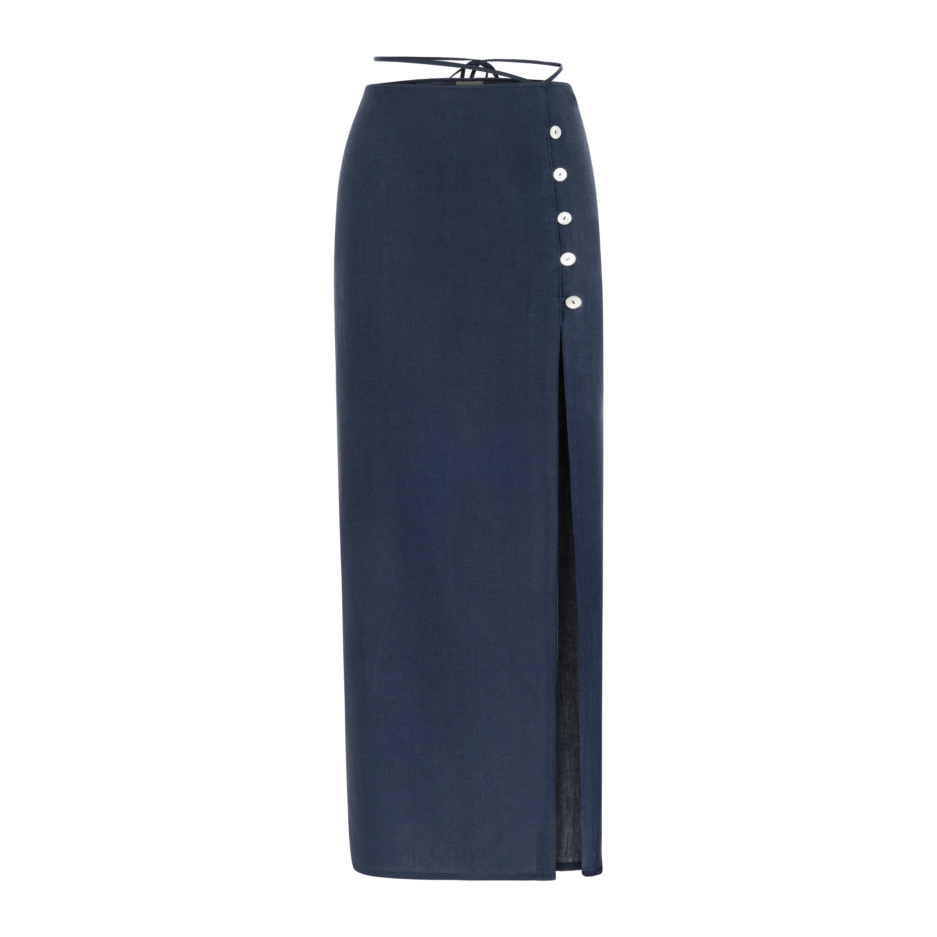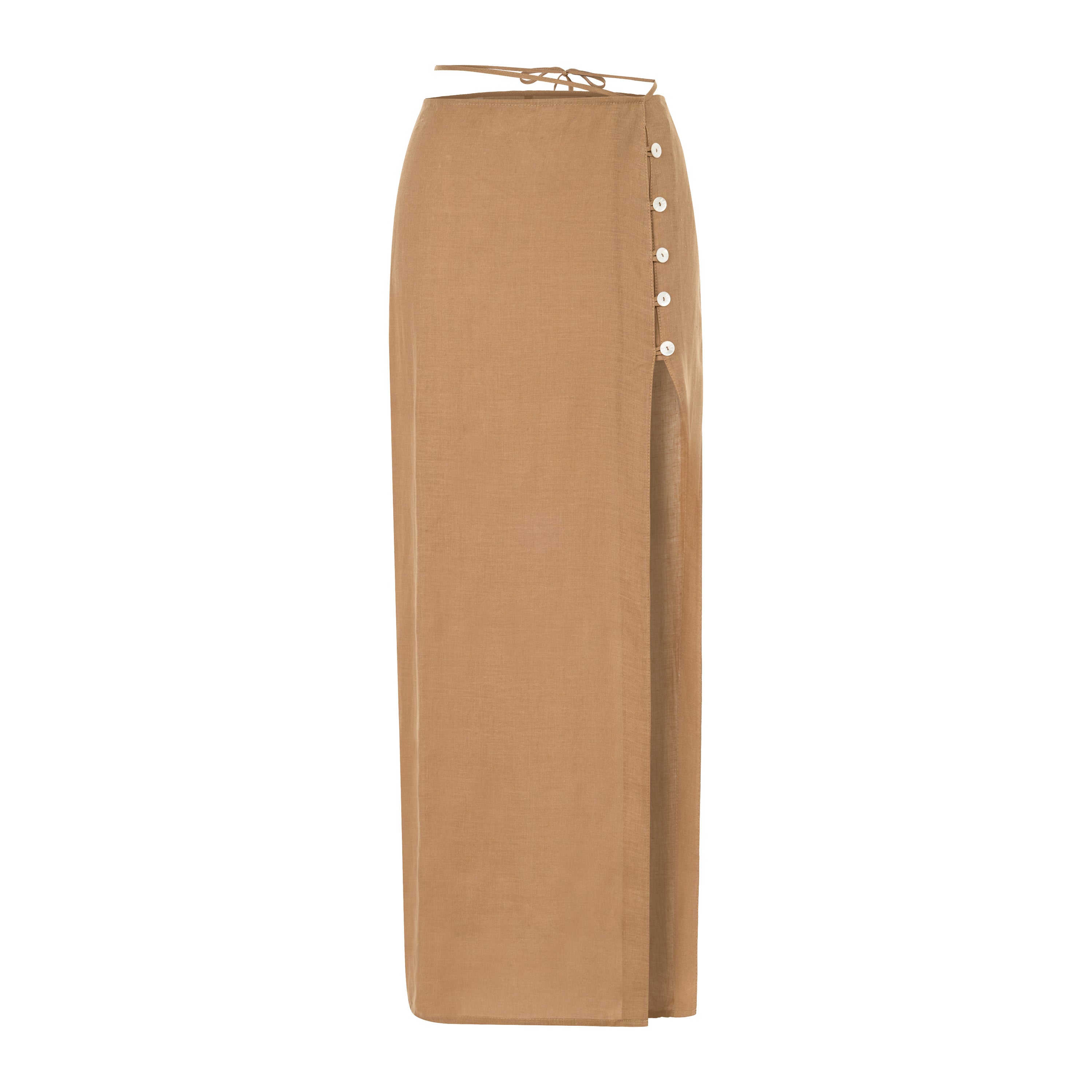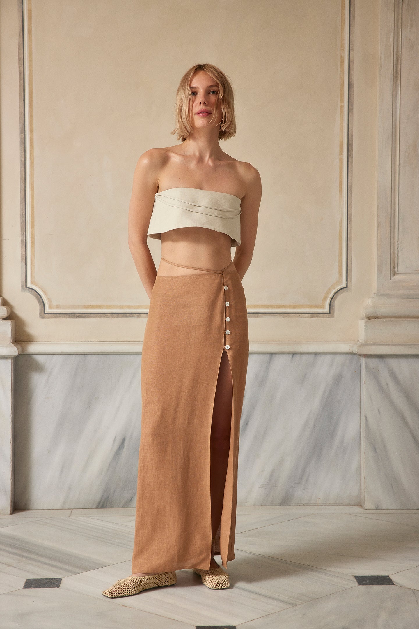 Midi skirt with side slit, spaghetti strap belt, and button closure.